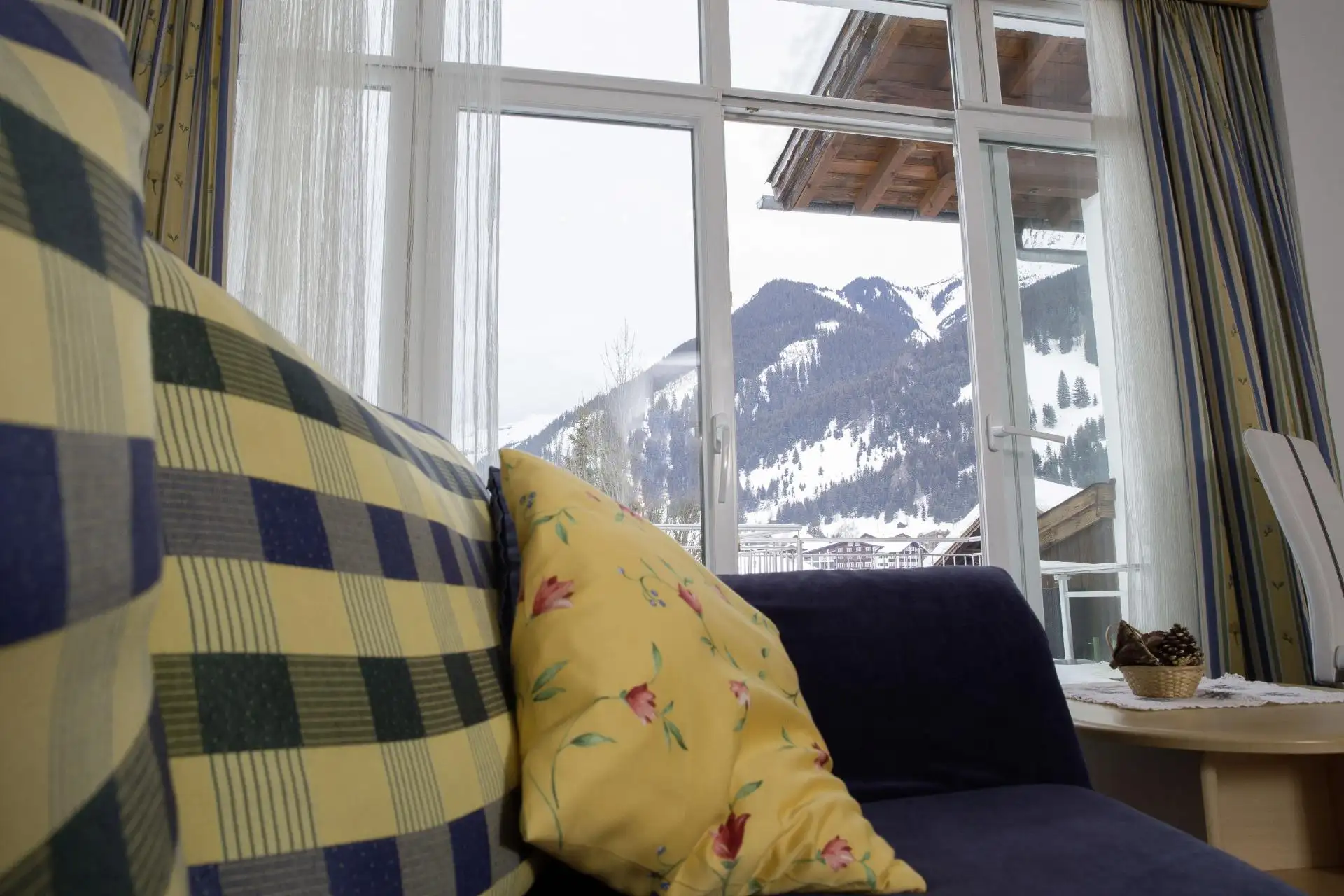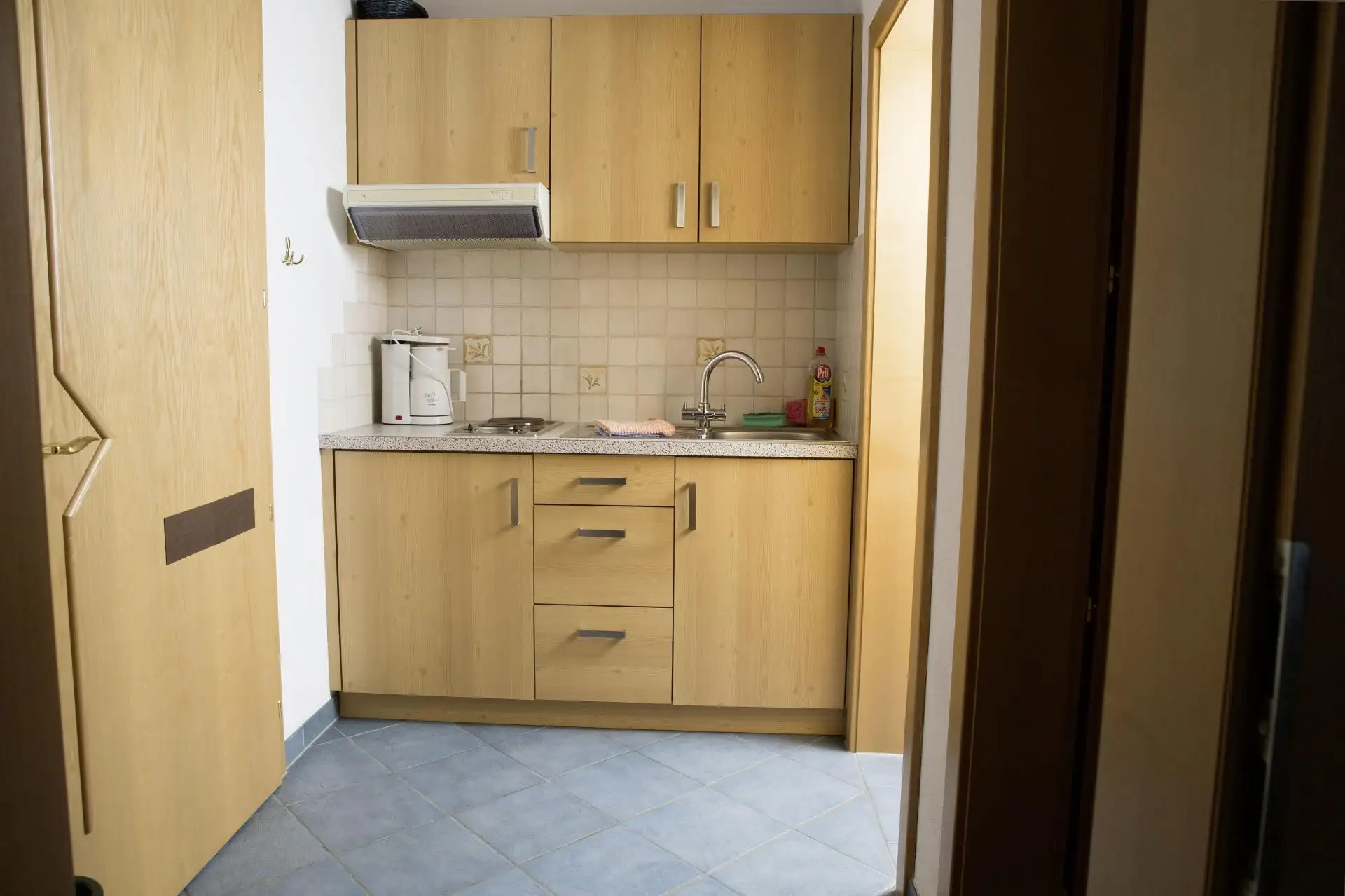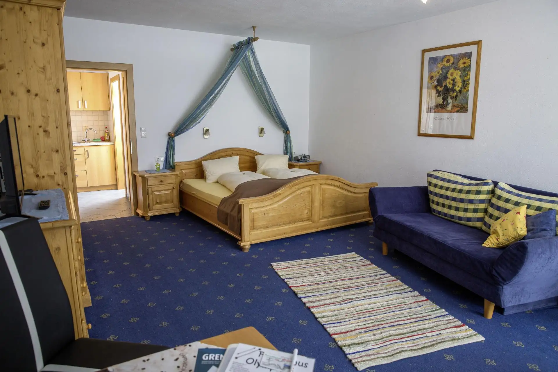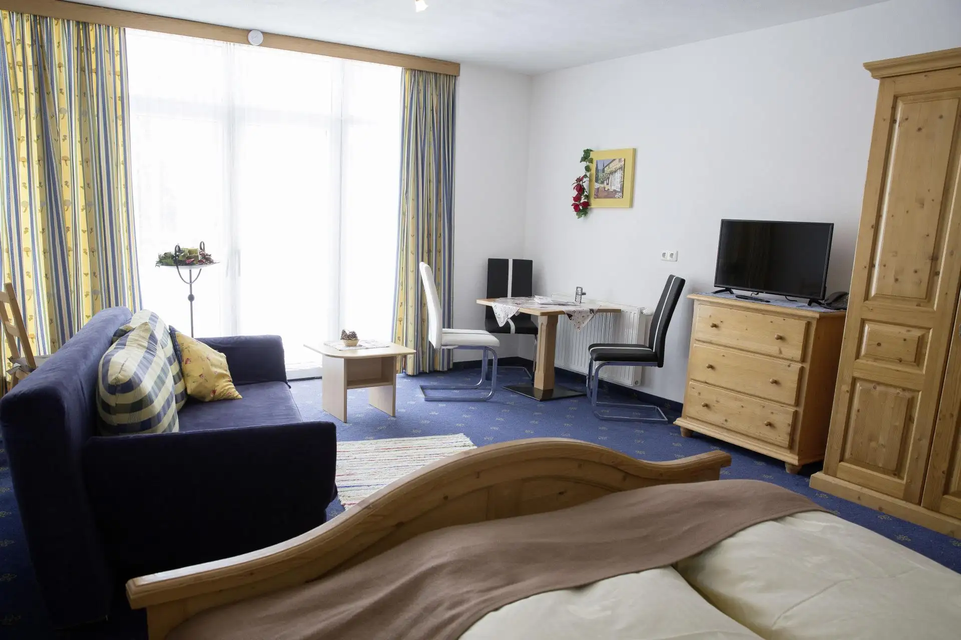 Apartment in Tyrolean style featuring one bedroom, a sofa bed, a flat-screen cable TV, a kitchenette with a dining area, a bathroom/shower, and a furnished balcony or terrace.